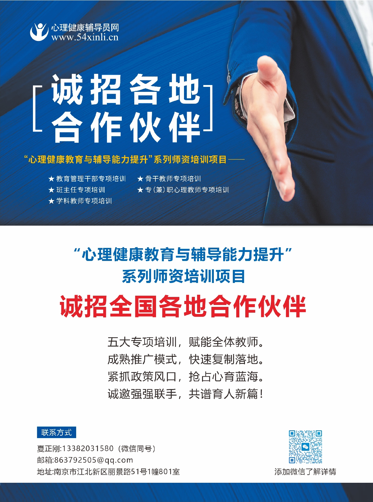 经过前期实践探索,已初步形成一套可复制、易落地的项目推广模式。为进一步拓展市场、扩大项目影响力,助力更多地区提升中小学教师心理健康育人能力,现根据业务发展需要,诚招全国各地合作伙伴。合作条件如下: