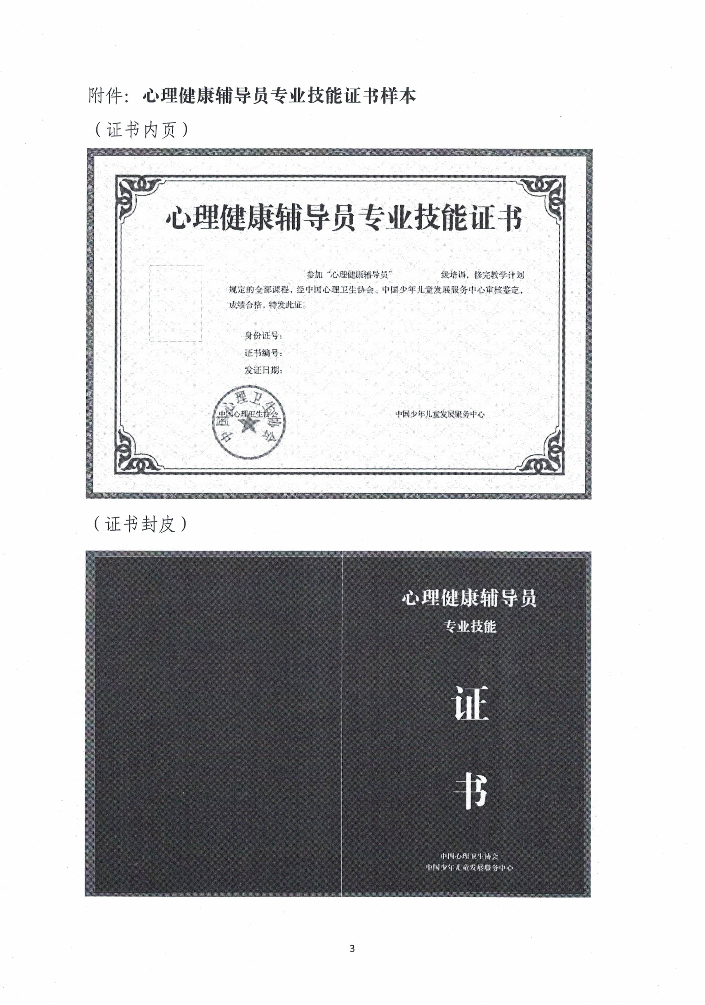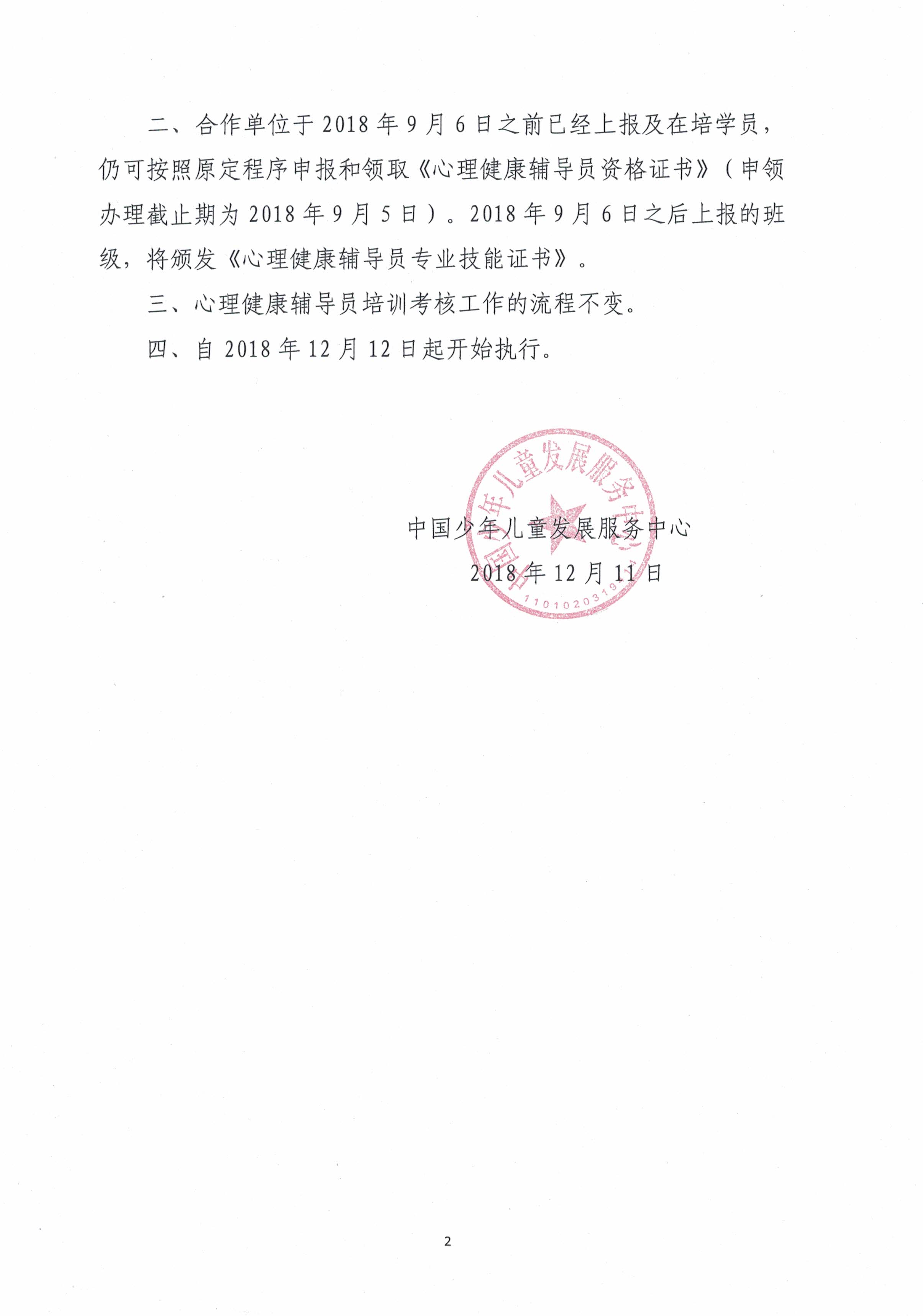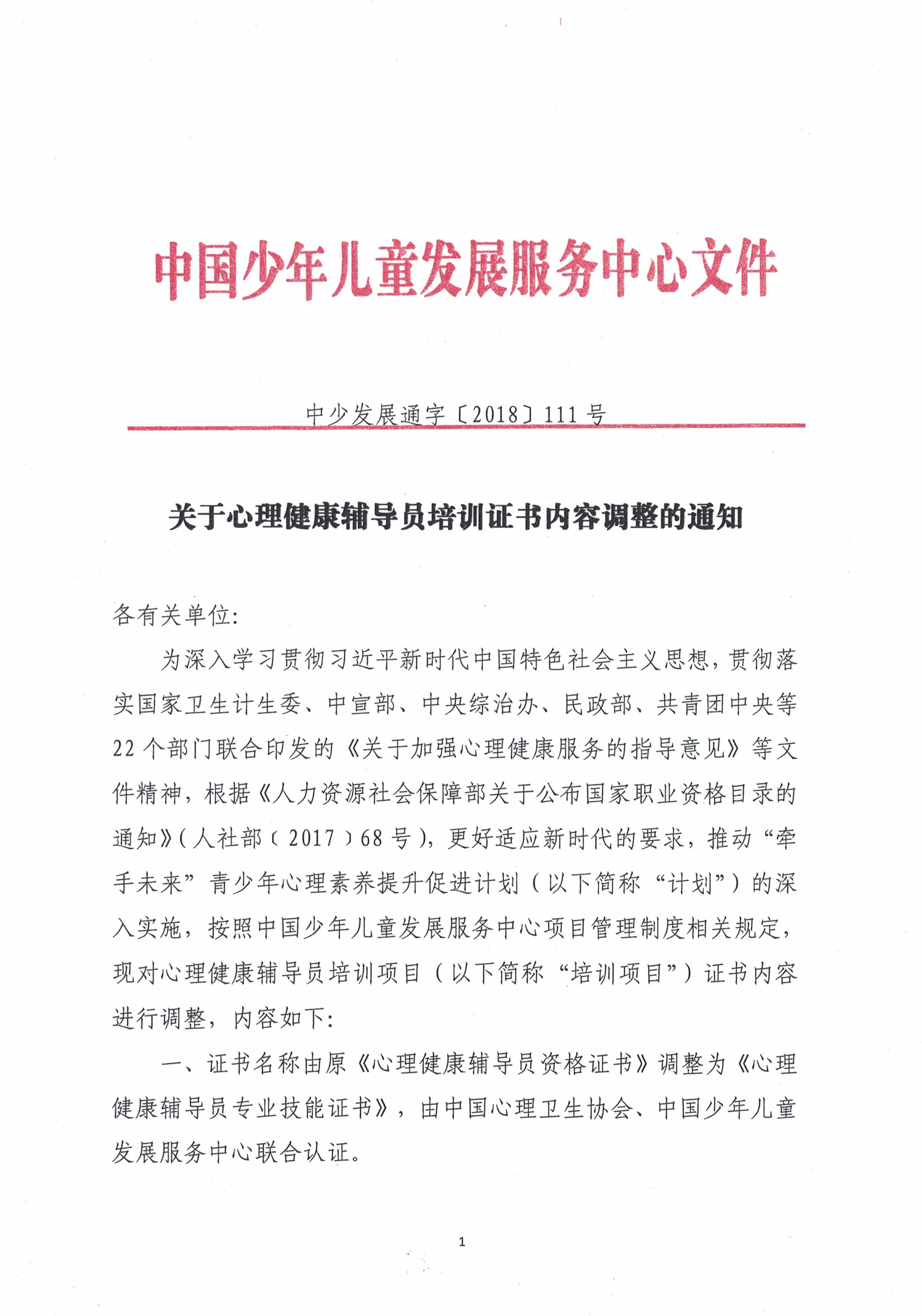 关于心理健康辅导员培训证书内容调整的通知(中少发展通字〔2018〕111号)