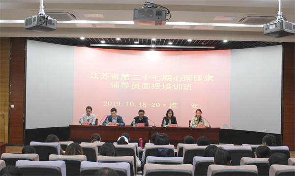 2019年10月18日下午,江苏省第二十七期心理健康辅导员面授培训班在淮阴师范学院举办。省青年研究会副会长、省少年儿童研究会副会长、共青团系统心理健康辅导员考核认证管理办公室江苏管理服务中心主任沈一功,淮阴师范学院团委书记纪元,共青团系统心理健康辅导员考核认证管理办公室江苏管理服务中心执行主任夏正刚,共青团系统心理健康辅导员考核认证管理办公室高级培训师金彩芬,淮阴师范学院团委办公室主任朱诗瑶等参加了开班活动。