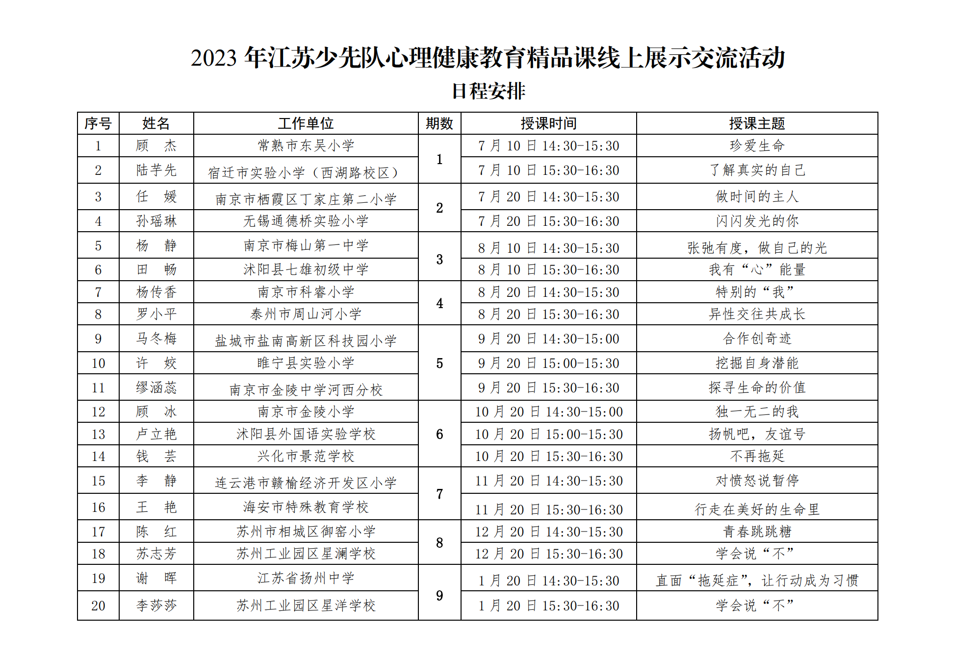 2023年5月,省少工委办公室、省少年儿童研究会为了促进江苏省少先队系统心理健康专业人才库成员之间相互学习交流,进一步提升心理健康工作能力和专业水平,在全省人才库成员中开展了心理健康教育精品课征集工作。经自荐申报、初选和专家复审,共有20节课程入选,并从2023年7月10日开始,分九期进行线上展示交流,面向全省所有人才库成员开放。