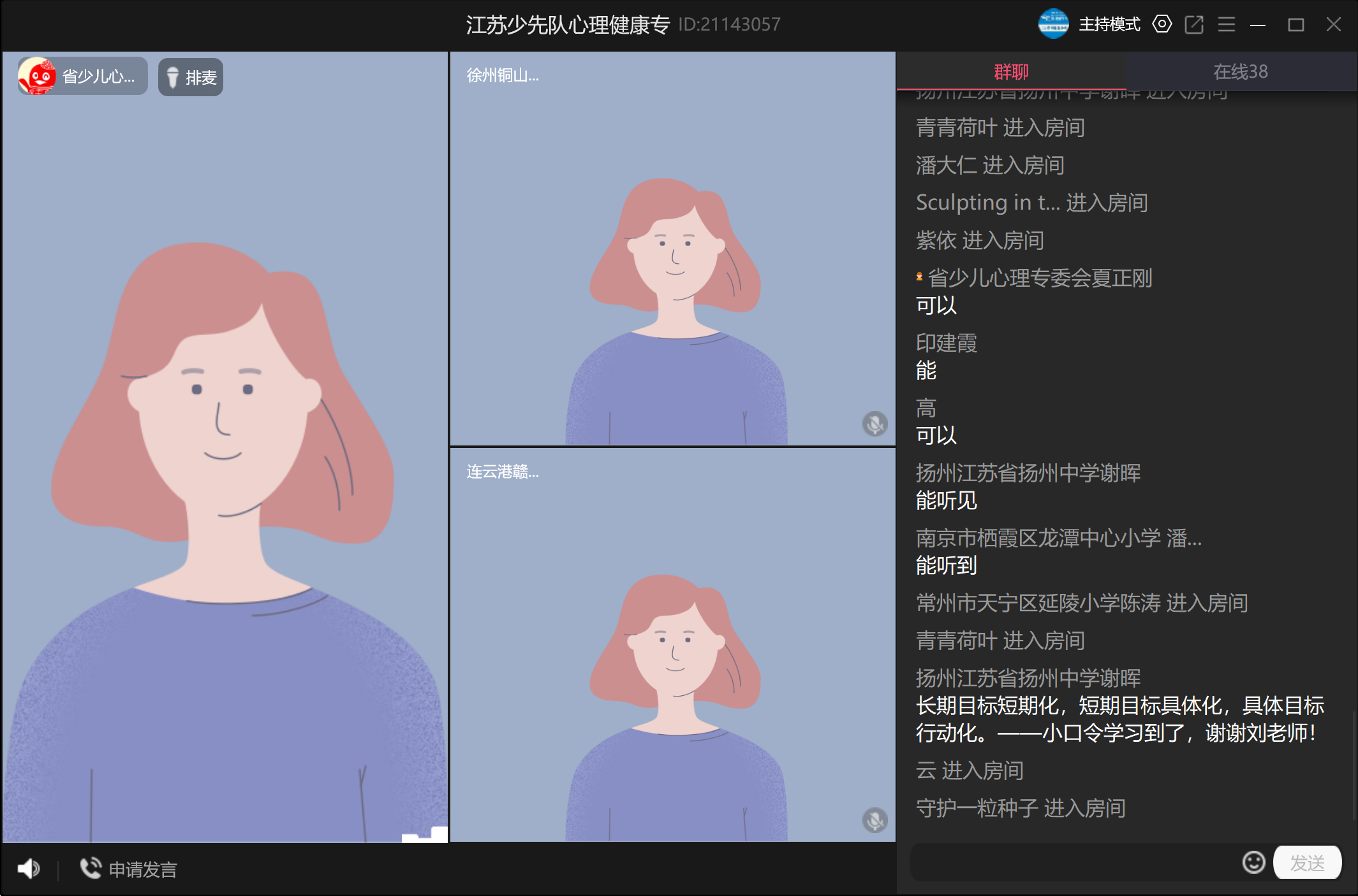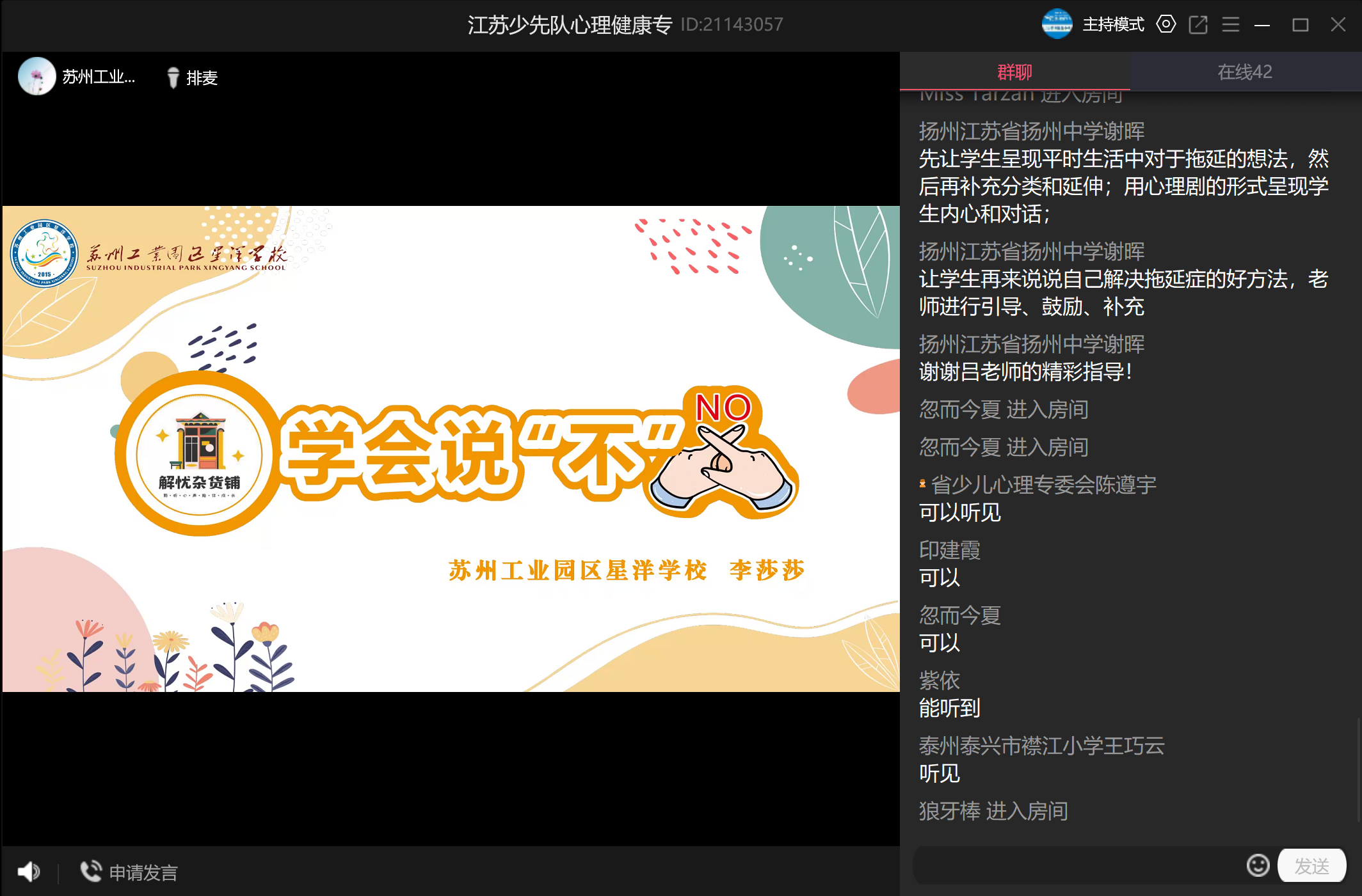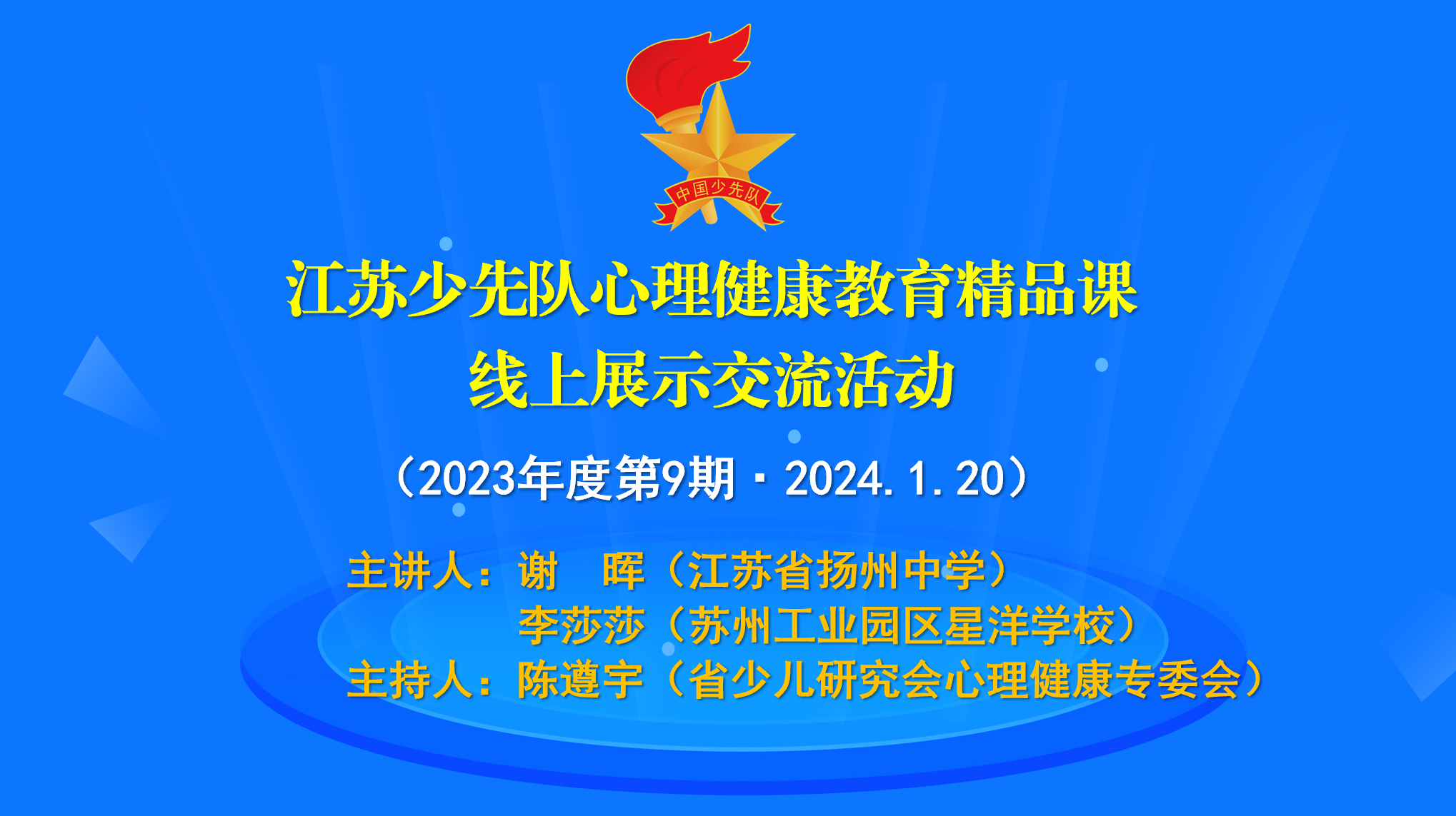 1月20日下午,2023年江苏少先队心理健康教育精品课线上展示交流活动(第九期)如期举行,来自江苏省扬州中学的谢晖老师和苏州工业园区星洋学校的李莎莎老师通过线上说课的形式,向江苏省少先队系统心理健康专业人才库的成员们展示了《直面“拖延症”,让行动成为习惯》和《学会说“不”》两节精彩的心理健康教育课,并有多位人才库成员进行了评课交流。展示交流活动结束后,省少年儿童研究会心理健康专委会秘书长、人才库负责人夏正刚对该活动进行了总结,并简要介绍了2024年度活动计划。至此,历时7个月的2023年江苏少先队心理健康教育精品课线上展示交流活动圆满结束。