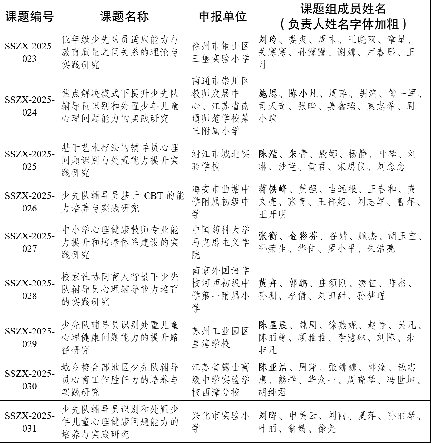 2025年度江苏省少先队心理健康专项课题立项名单