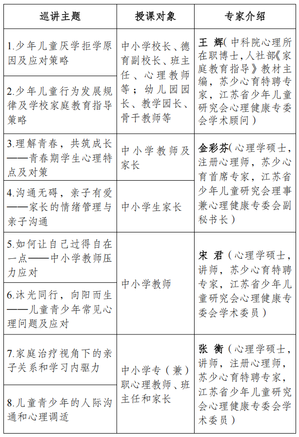 2025年政府工作报告中提出“普及心理健康教育,关爱师生身心健康”。为贯彻落实教育部等十七部门印发的《全面加强和改进新时代学生心理健康工作专项行动计划(2023-2025年)》和共青团中央、全国少工委《关于加强共青团新时代未成年人保护工作的意见》等文件精神,进一步加强心理健康科普宣传,营造全社会关心关注、支持参与学生心理健康教育的良好氛围,提升师生和家长心理健康知识水平和素养,江苏省少年儿童研究会心理健康专业委员会拟联合有关单位,共同举办“关爱心灵,护航成长——苏少心育2025公益巡讲”活动,具体方案如下。