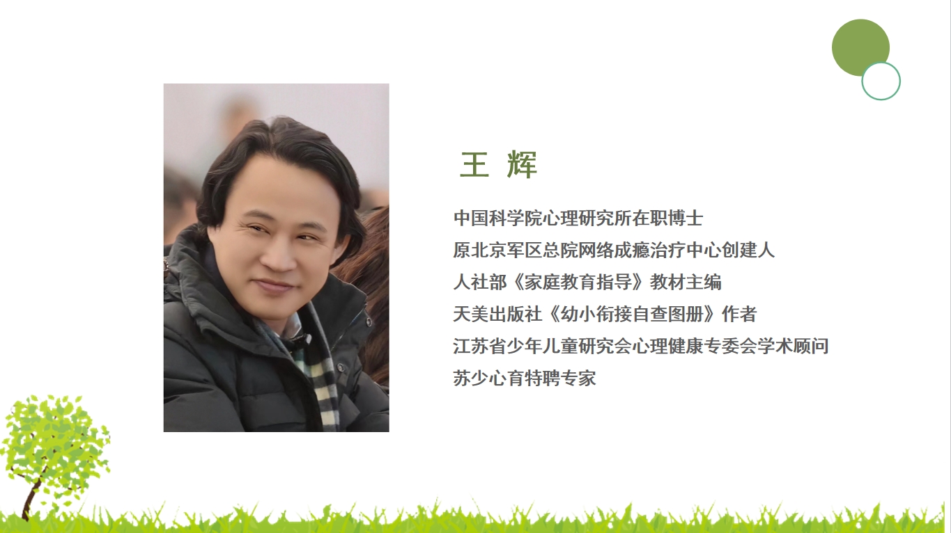 本期活动邀请中国科学院心理研究所在职博士、原北京军区总院网络成瘾治疗中心创建人、人社部《家庭教育指导》教材主编、天美出版社《幼小衔接自查图册》作者、江苏省少年儿童研究会心理健康专委会学术顾问、苏少心育特聘专家王辉博士为各地带来主题为《少年儿童厌学拒学原因及应对策略》的公益讲座。