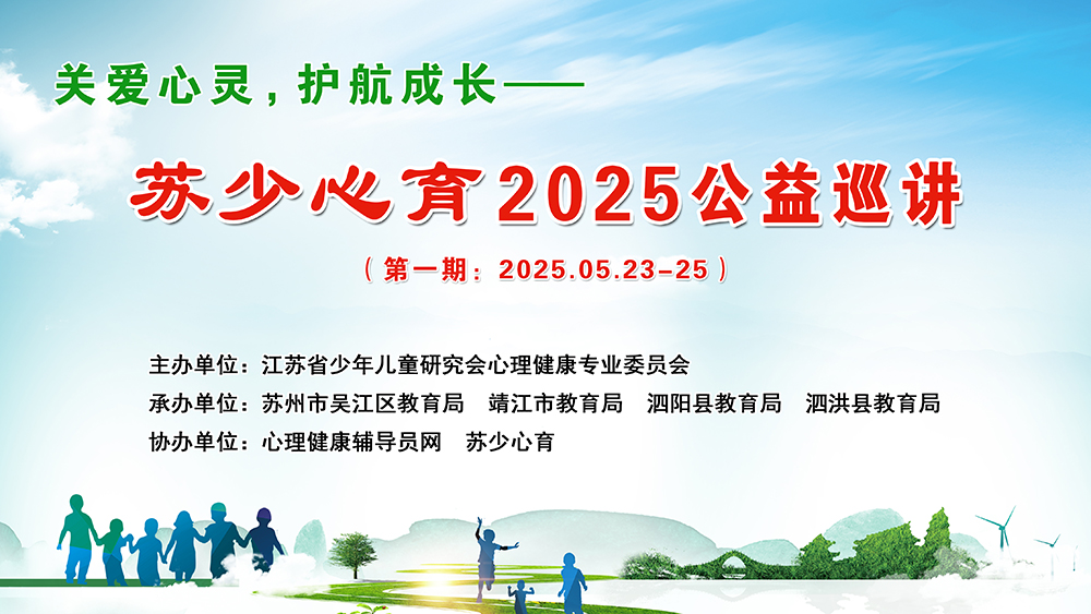 5月23日至25日,由江苏省少年儿童研究会心理健康专业委员会主办,苏州市吴江区教育局、靖江市教育局、泗阳县教育局、泗洪县教育局承办,心理健康辅导员网、苏少心育协办的“关爱心灵,护航成长——苏少心育2025公益巡讲(第一期)”分别在吴江、靖江、泗阳和泗洪举办,四场活动共吸引2000余名中小学校长、班主任、心理教师和学生家长参加。
