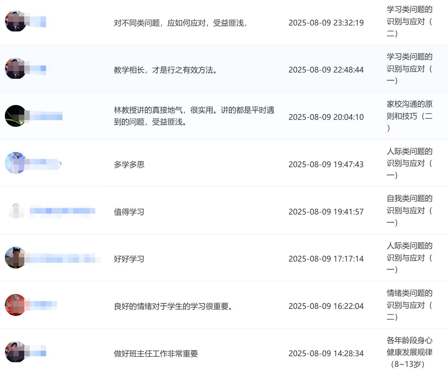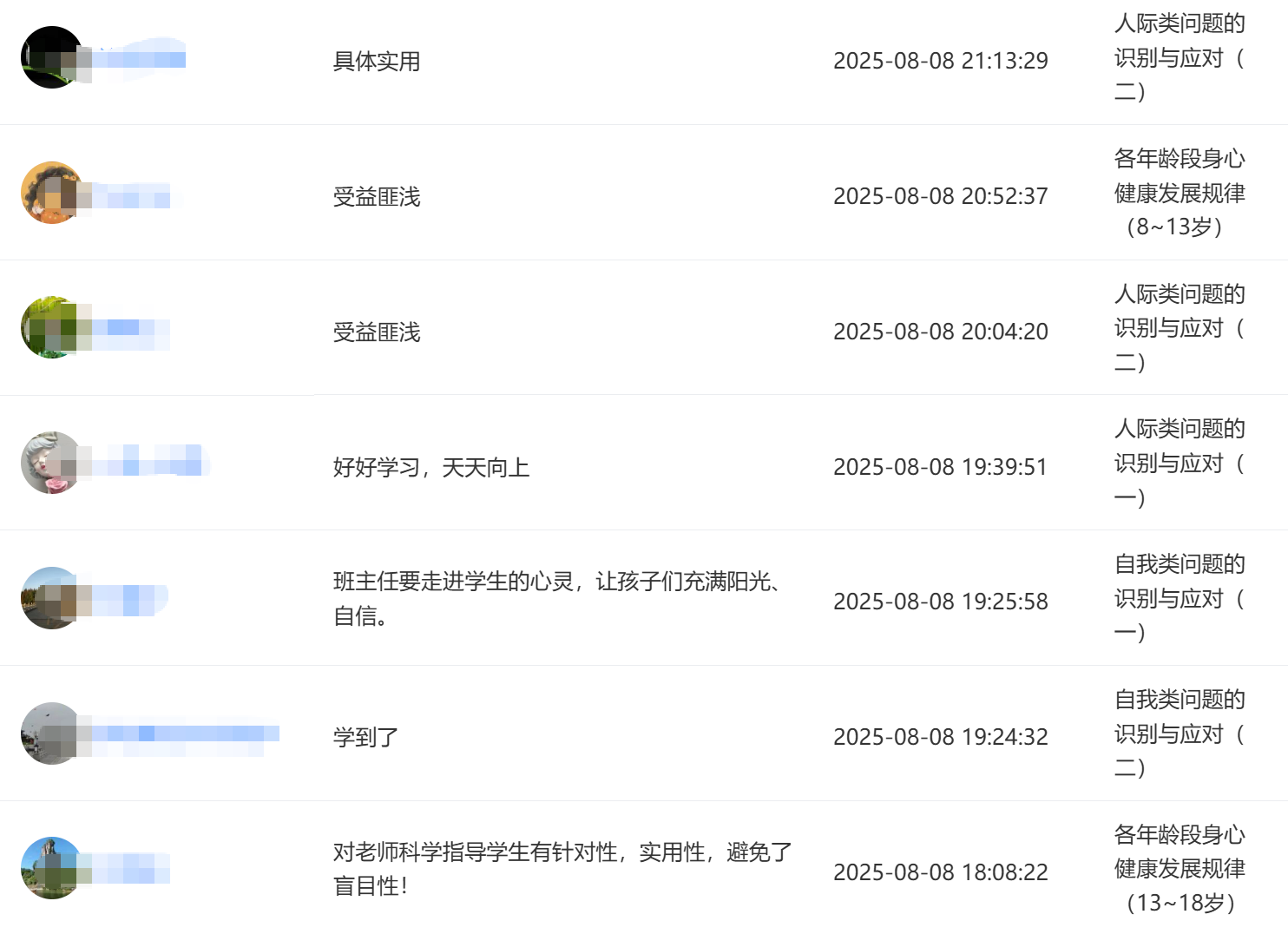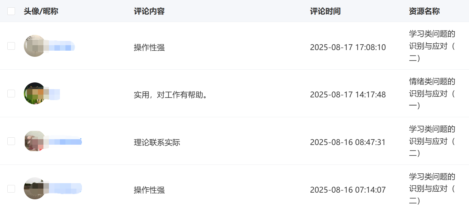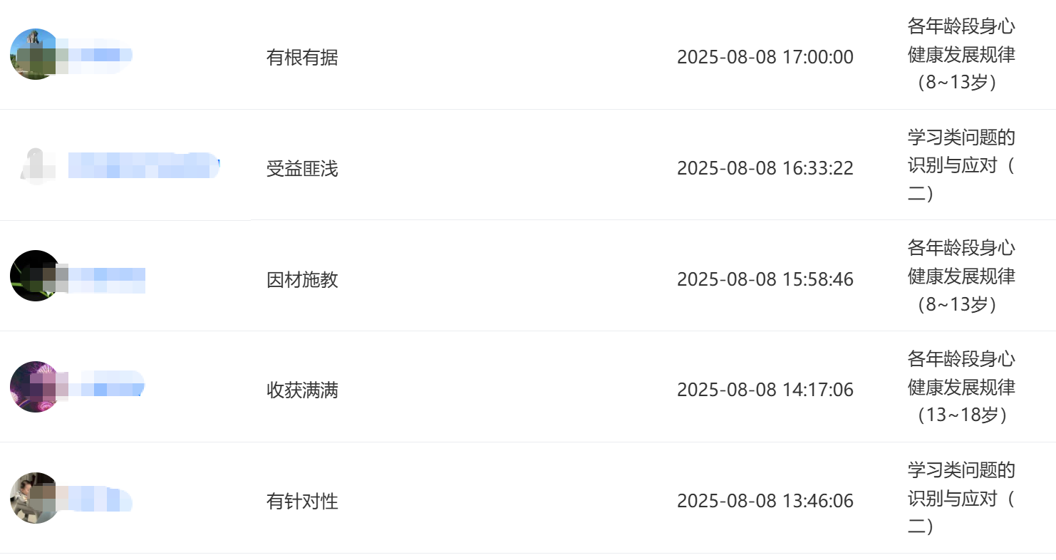2025年8月,江苏省某县级市教育局采用“心理健康教育与辅导能力提升”系列师资培训课程中的部分网络课程对全市2200多名中小学班主任进行能力提升培训,课程内容得到了学员们的广泛好评。如图: