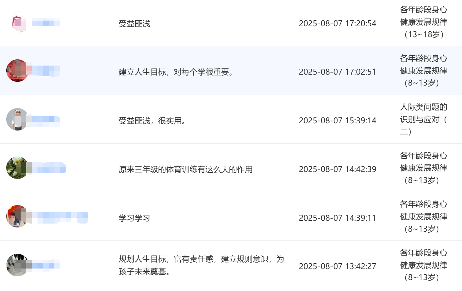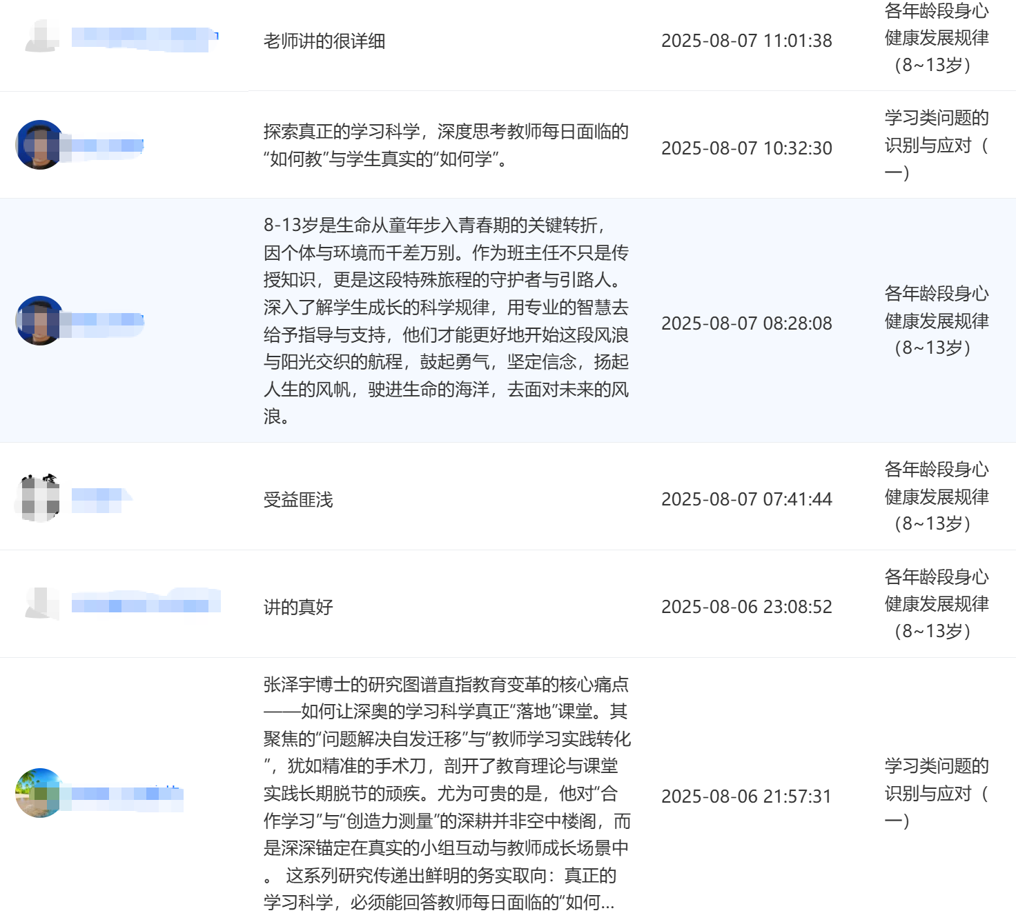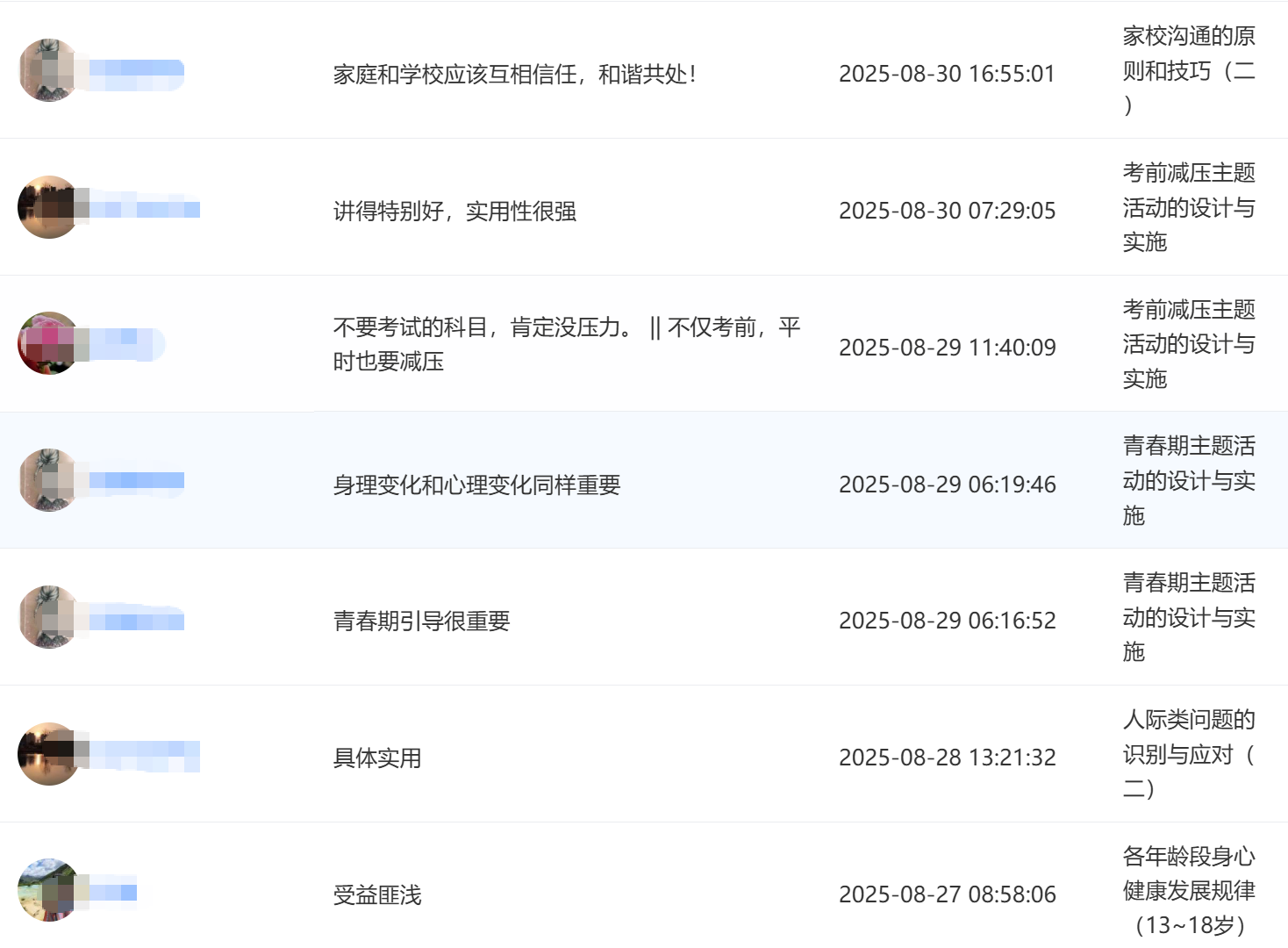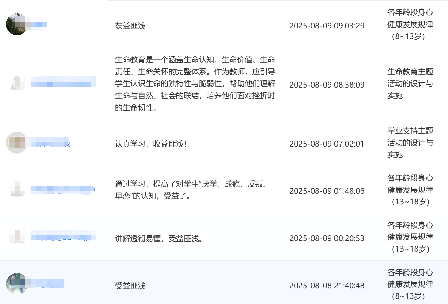 2025年8月,江苏省某县级市教育局采用“心理健康教育与辅导能力提升”系列师资培训课程中的部分网络课程对全市2200多名中小学班主任进行能力提升培训,课程内容得到了学员们的广泛好评。如图: