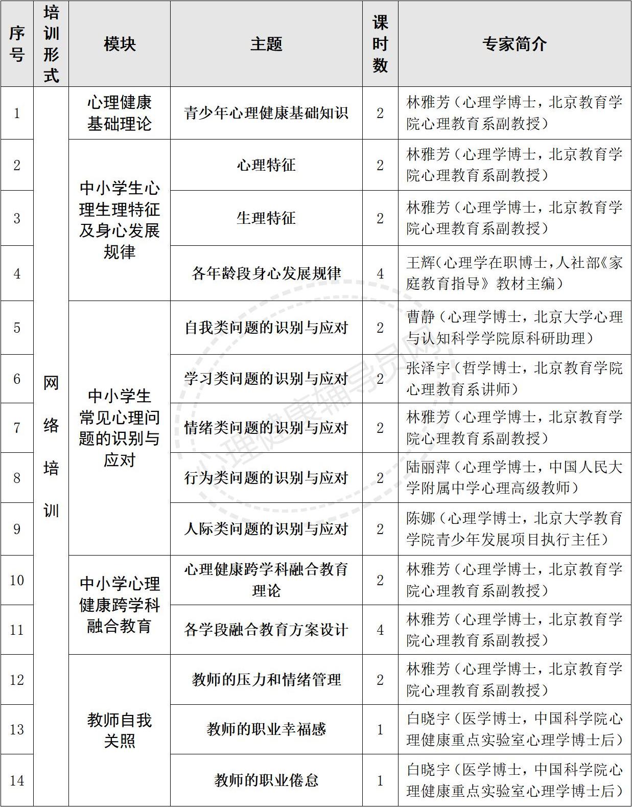 2.培训目标:帮助中小学学科教师增强心理健康教育意识,提升学科教学与心理健康教育跨学科融合能力,掌握课堂教学中渗透心理健康教育的实用方法,提高对学生心理行为偏常的早期识别能力,实现知识传授与心理培育协同发展。