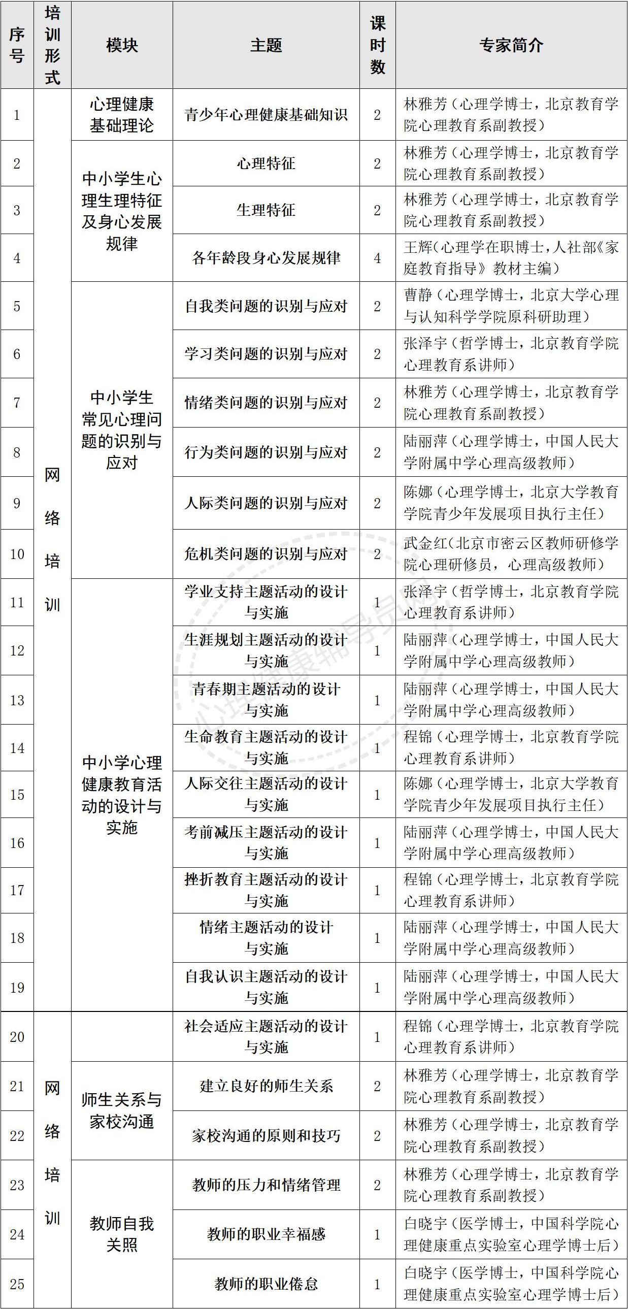 2.培训目标:帮助中小学班主任提升心理健康教育与班级管理融合能力,熟练掌握学生心理问题识别与应对方法,优化师生关系与家校沟通策略,构建积极健康、温暖包容的班级心理氛围,助力学生身心健康成长。