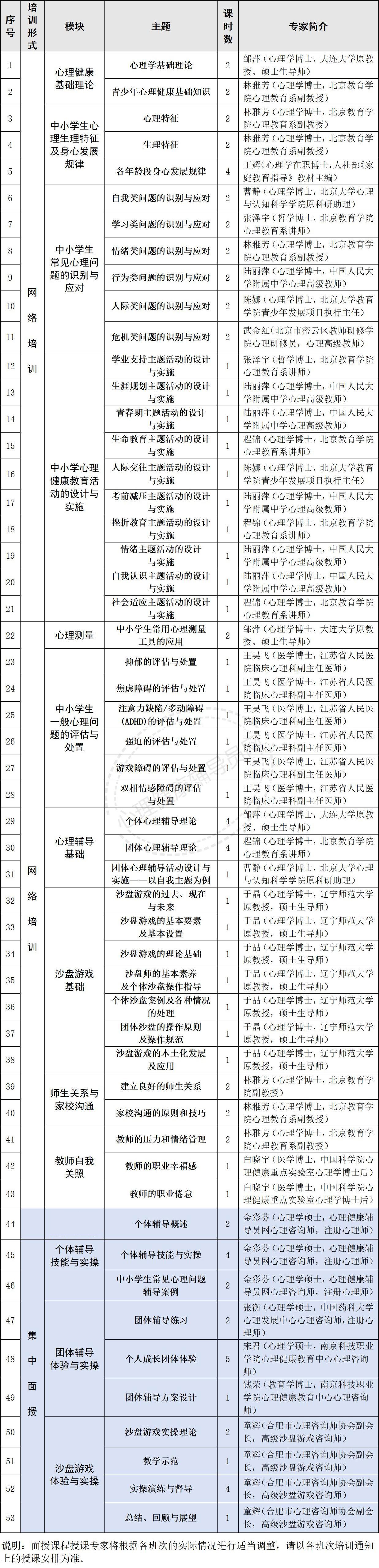 2.培训目标:重点提升中小学骨干教师对学生一般心理问题的评估与干预能力,熟练掌握个体与团体心理辅导基本技能,将学生心理问题解决在萌芽阶段,打造学校心理健康工作的中坚力量。