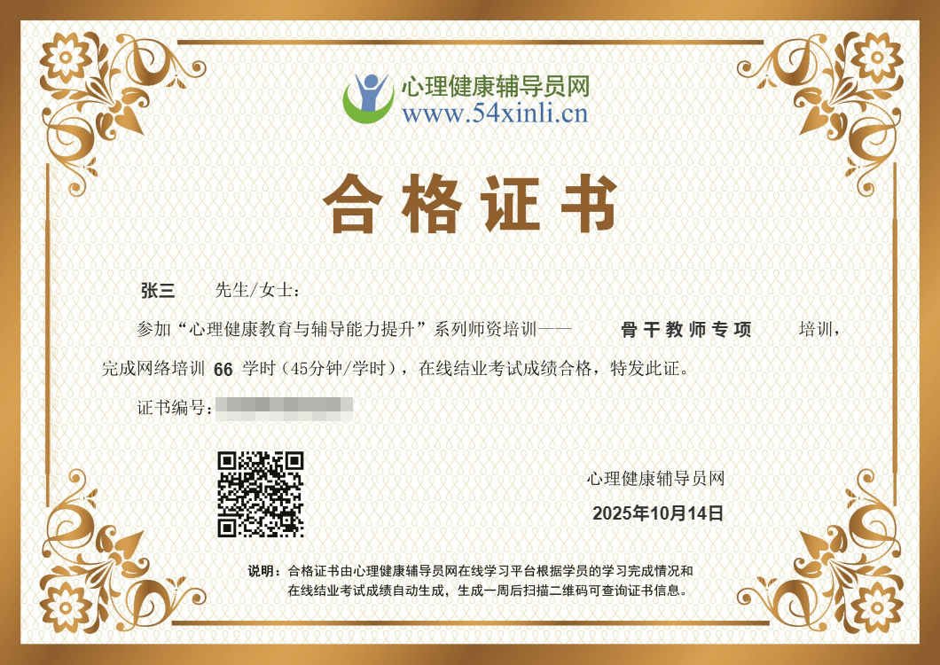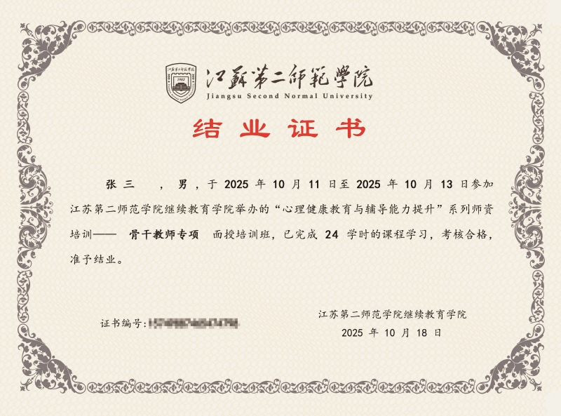 5.考核方式:在线结业考试加实践考核。完成所有章节学习后,进行在线结业考试,考试题型分为单选题、多选题和判断题,总分100分,得分60分及以上为合格,在线结业考试最多可以考3次,成绩合格平台自动生成电子版《合格证书》;实践考核为参加集中面授培训结束后一个月内,撰写并提交《个体心理辅导案例分析报告》和《心理健康教育教学案例》各一份,每门总分100分,每门得分60分及以上为合格,考核合格的由江苏第二师范学院继续教育学院颁发《结业证书》,考核不合格的可免费补考一次。