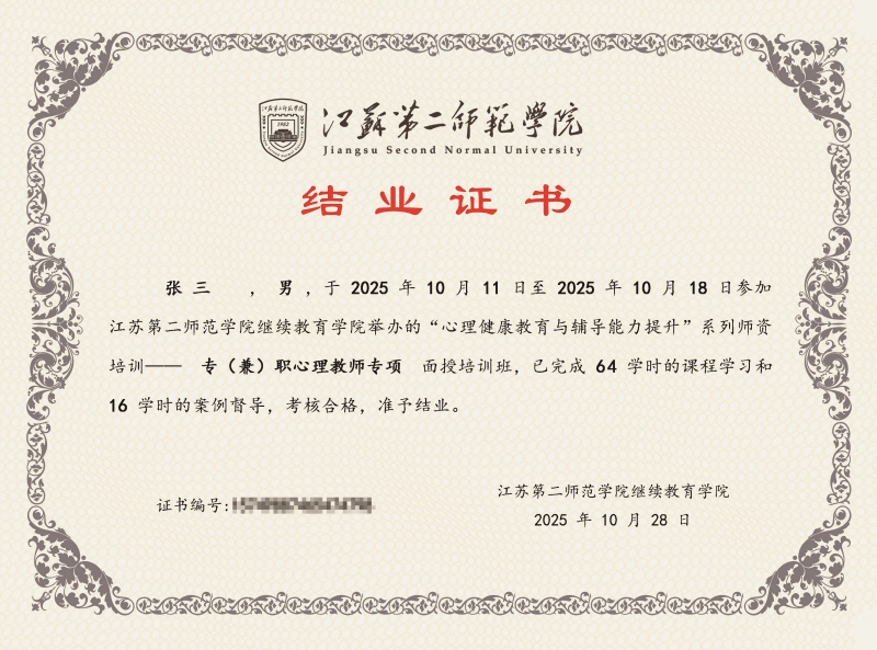 5.考核方式:在线结业考试加实践考核。完成所有章节学习后,进行在线结业考试,考试题型分为单选题、多选题和判断题,总分100分,得分60分及以上为合格,在线结业考试最多可以考3次,成绩合格平台自动生成电子版《合格证书》;实践考核为参加网络团体案例督导结束后一个月内,撰写并提交一份《个体心理辅导案例分析报告》和该辅导案例连续15分钟的逐字稿,案例报告和逐字稿初审通过后进行网络答辩,总分100分,得分60分及以上为合格,考核合格的由江苏第二师范学院继续教育学院颁发《结业证书》,考核不合格的可免费补考一次。